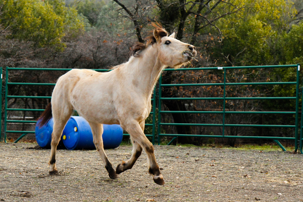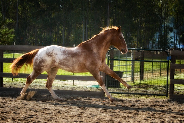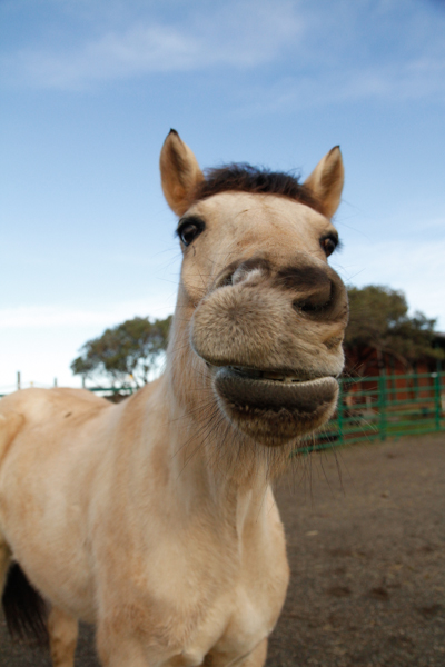 Next meet my crazy horse Chiron. He is one of the funniest characters in our clan. He is a 6 year old quarter horse and loves to play. Here you see him on his daily morning routine of running around like a manic which always includes coming up to say hi to me, flapping his nose around and sticking it in the camera just like the donkeys.