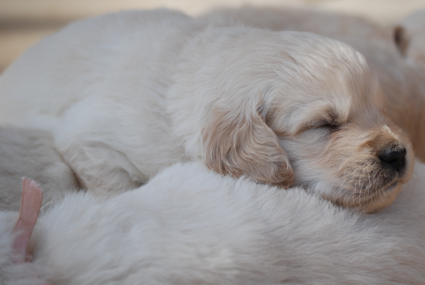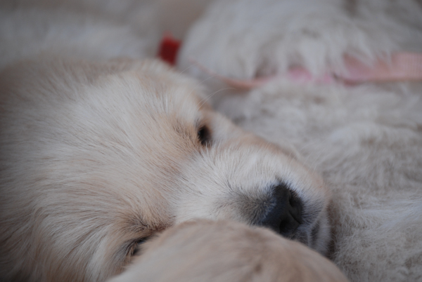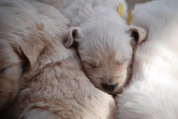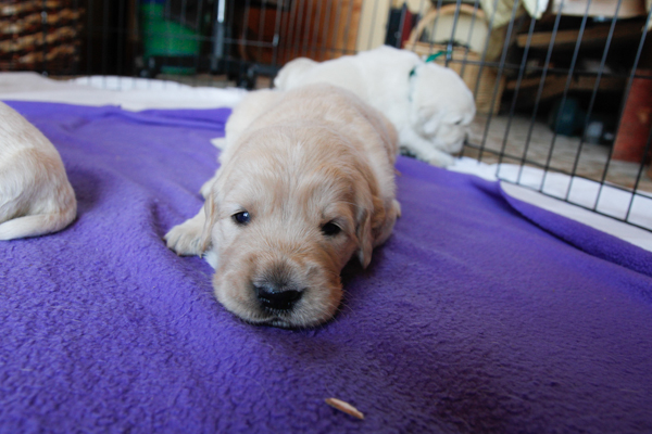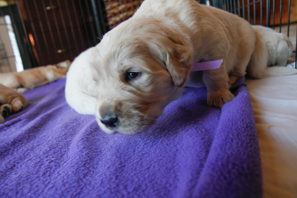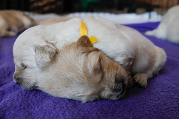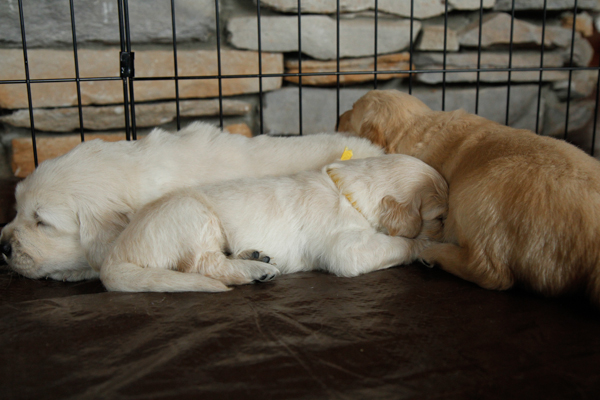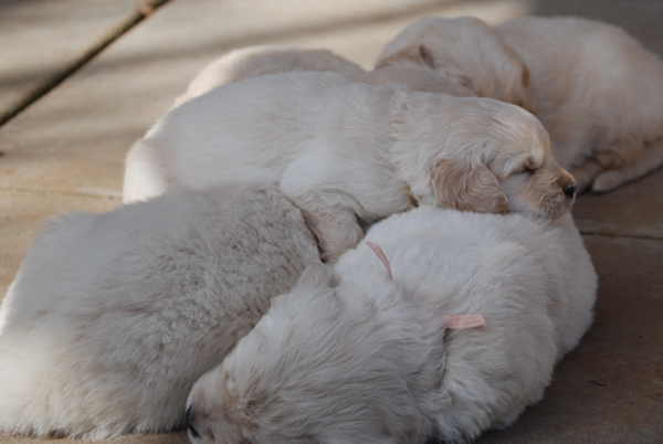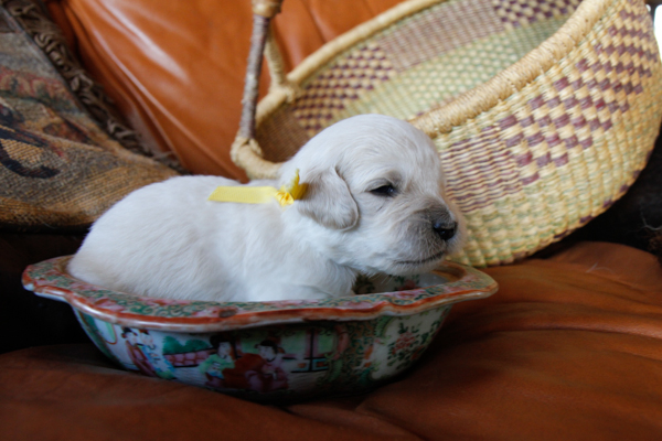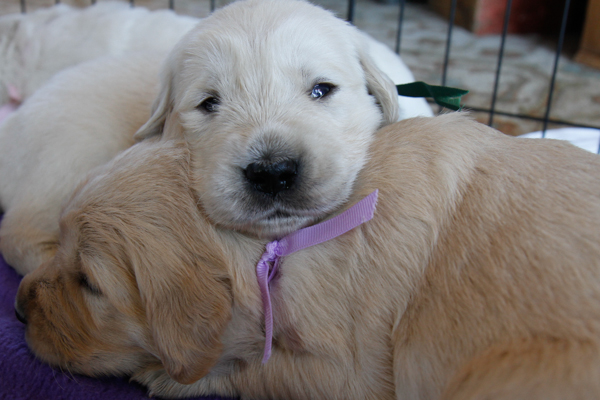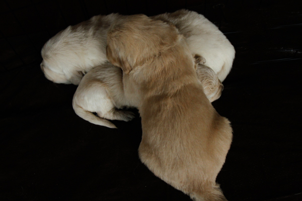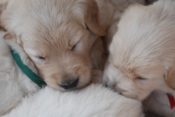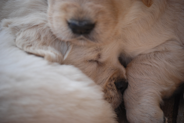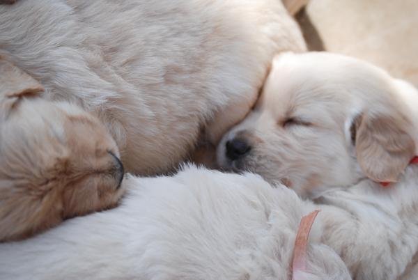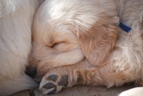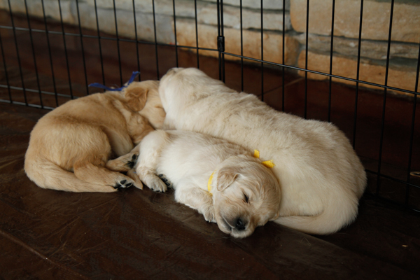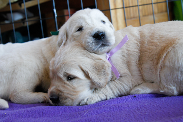 I lied. I have some secret new family members at Sundog Ranch. They are a litter of three week old Golden Retrievers. Let’s just call them the THE SUNDOG BABIES for now. They are babies of our Miss Maisie Rose and her special friend who lives in another town, Black Jack Casanova. Whenever we have a litter of new Sundogs we have a puppy name theme. This year we have named these babies after American Indian tribes and names. Here we have Chinook, a big white male with a green ribbon. He is seen here cuddling with Tenaya, a girl, in lavender. As you can see they are very comfortable with each other.