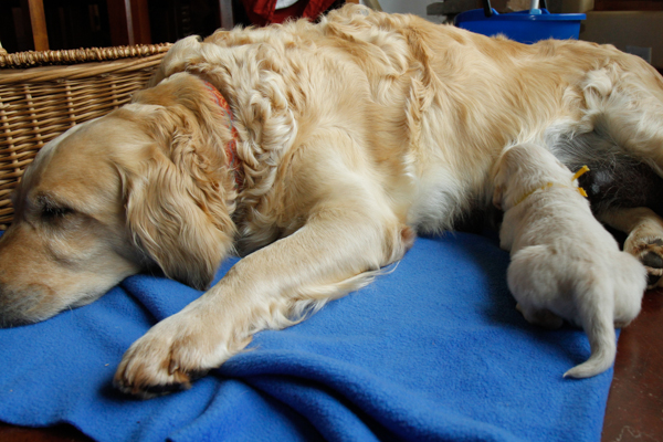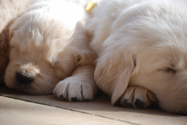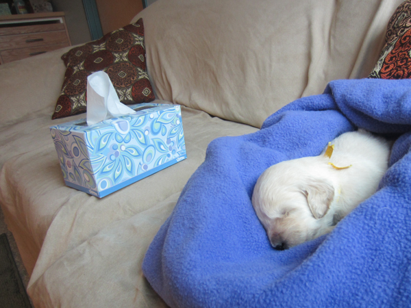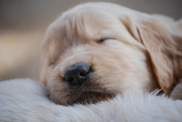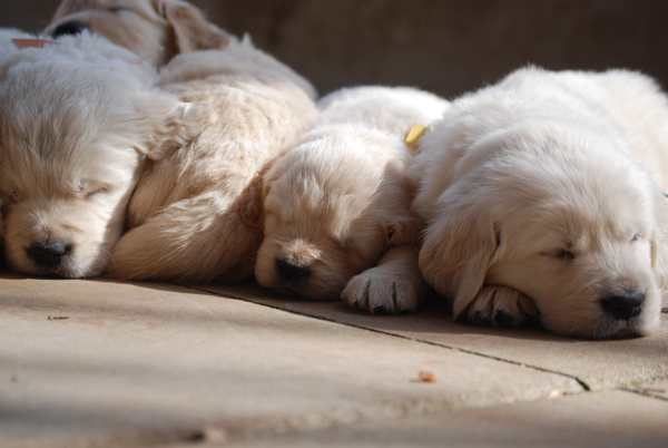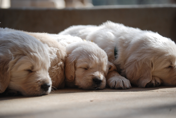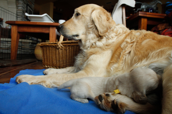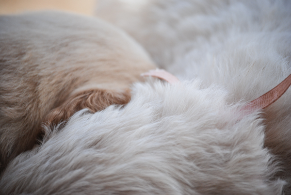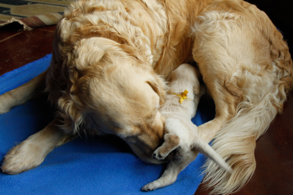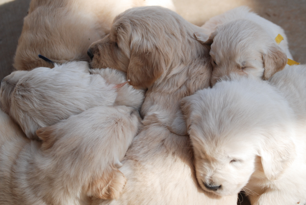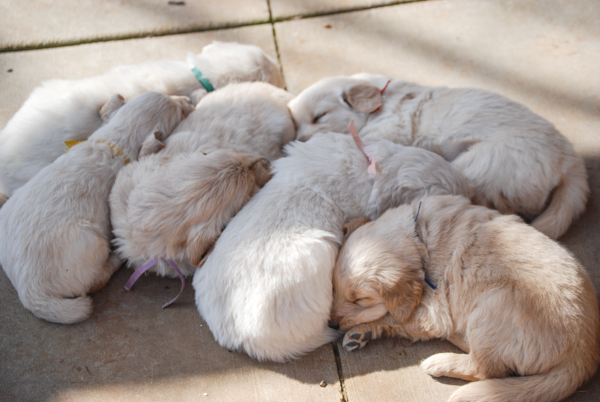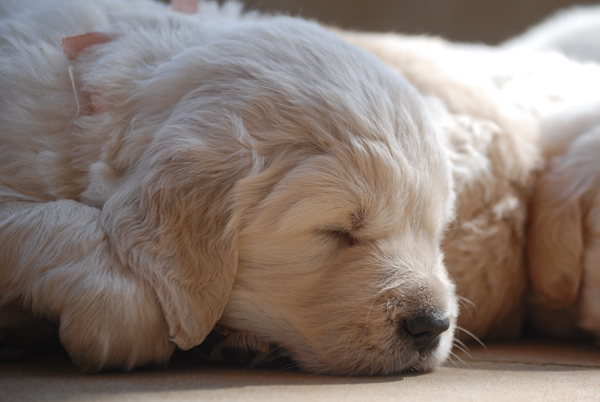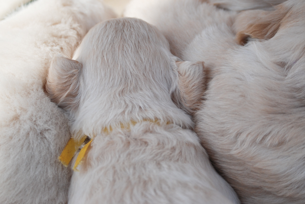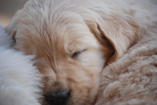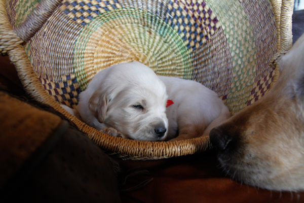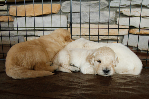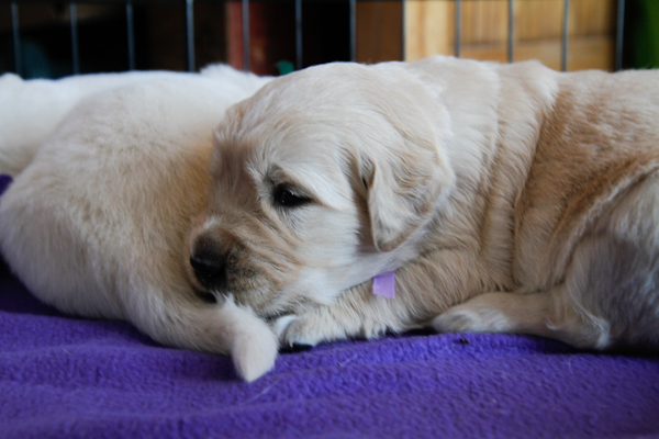 I lied. I have some secret new family members at Sundog Ranch. They are a litter of three week old Golden Retrievers. Let’s just call them the THE SUNDOG BABIES for now. They are babies of our Miss Maisie Rose and her special friend who lives in another town, Black Jack Casanova. Whenever we have a litter of new Sundogs we have a puppy name theme. This year we have named these babies after American Indian tribes and names. Here we have Chinook, a big white male with a green ribbon. He is seen here cuddling with Tenaya, a girl, in lavender. As you can see they are very comfortable with each other.