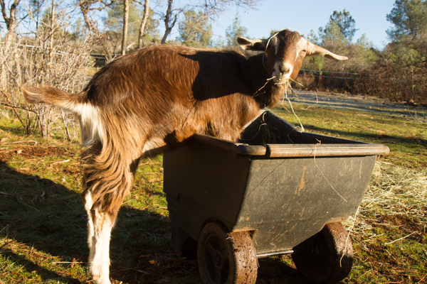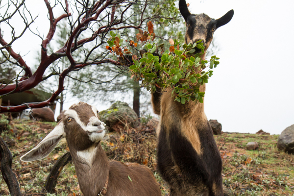 Redbud when it is leafed out is their favorite. Lucky for this tribe of goats, we have plenty of it around here. Did you know a herd of goats is called a tribe or a trip? My goats are a trip! Goats are browsers and go from one scrub to another. We have plenty for them to choose from. They like grass but prefer scrub oak, poision oak, manzanita, toyon and buckbrush just to name a few. The only problem is that most are not leafed out in the winter so unless we feed some grass hay they start to strip the bark off a lot of things eventually killing the plant. NOT good especially on our propagated trees that we need for shade around here. Another lesson I’ve learned while becoming a country woman using goats to manage this land.