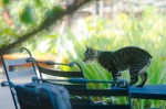 I look down from GQ thinking I better start getting hay out and I squint to see Mangus with something flapping in his mouth. It looks like he has caught a tiny fish or something. He crouches and appears to not know what the heck he has. I swing my camera around and can’t get my settings right but oh well. You can see something here. It is NOT a wood rat which is what he is suppose to be feasting on. Mangus is as surprised as I am. “Hmmm…what to do with this?” Then before I could say MEOW…….